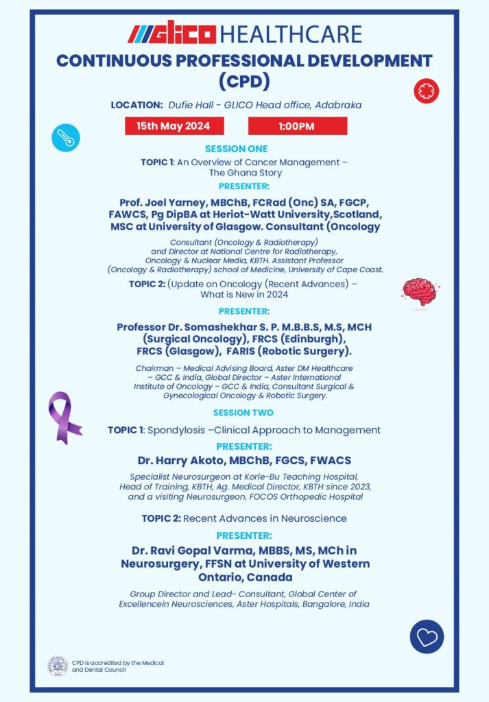 Join us for an enriching CPD event on May 16th, 2024, at Dufie Hall, GLICO Head Office, Adabraka, Accra. Network with local and foreign specialists in Oncology, Neuroscience, Obstetrics, Gynaecology, and Orthopedics. Register now for free: