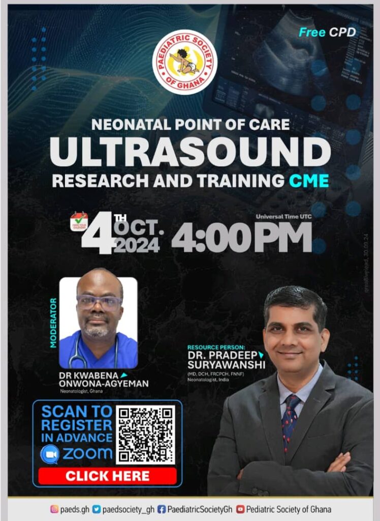 Join this free CPD organized by paediatrics Society Of Ghana on Learning how ultrasound can be used to identify lung pathology, endotracheal tube position, aid central line insertion, and basic cardiac functional assessment